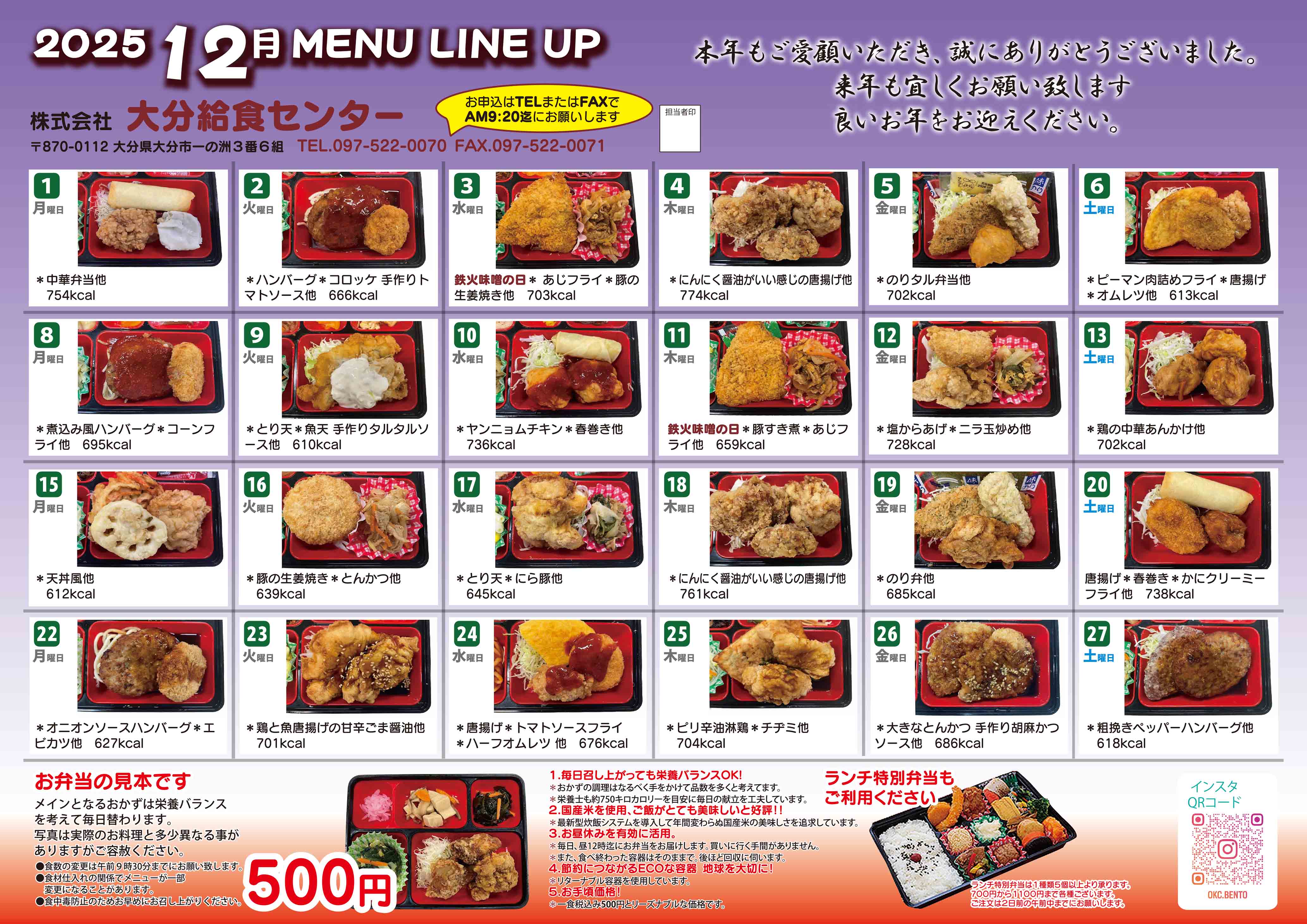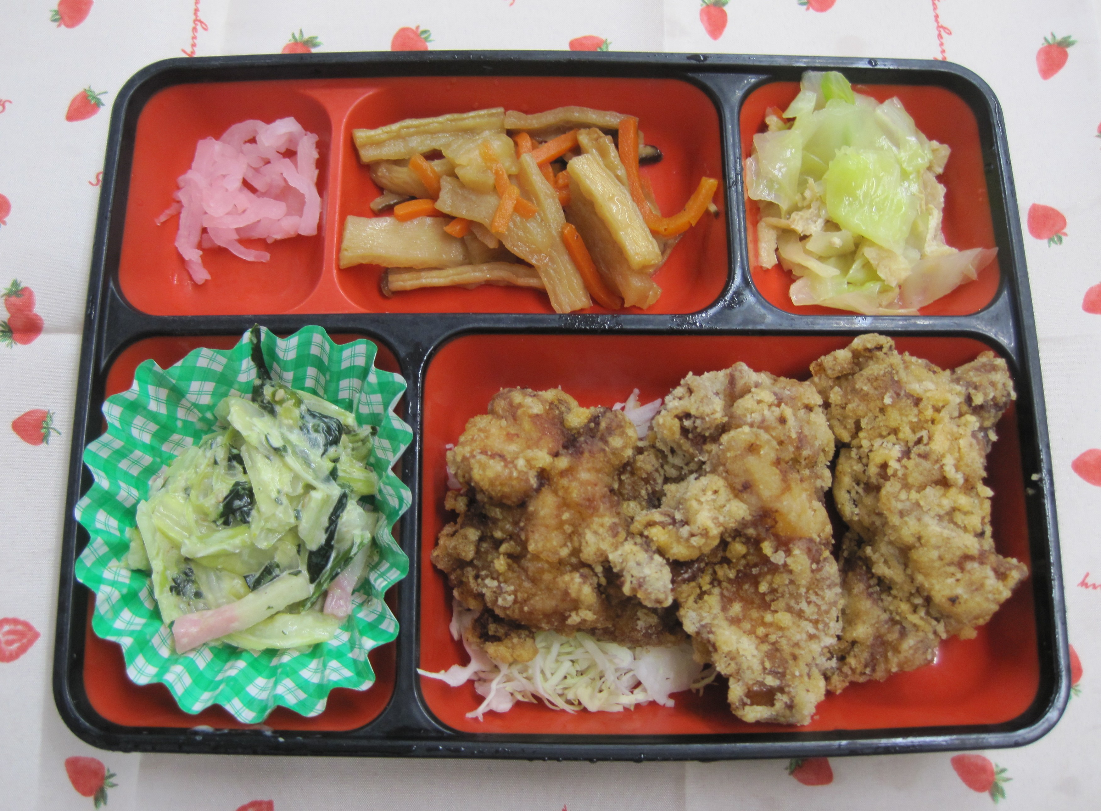 白身フライ/唐揚げ/串カツ )手作りタルタルソース*ポテトサラダ*ひじき煮*果物)みかん缶*その他 |